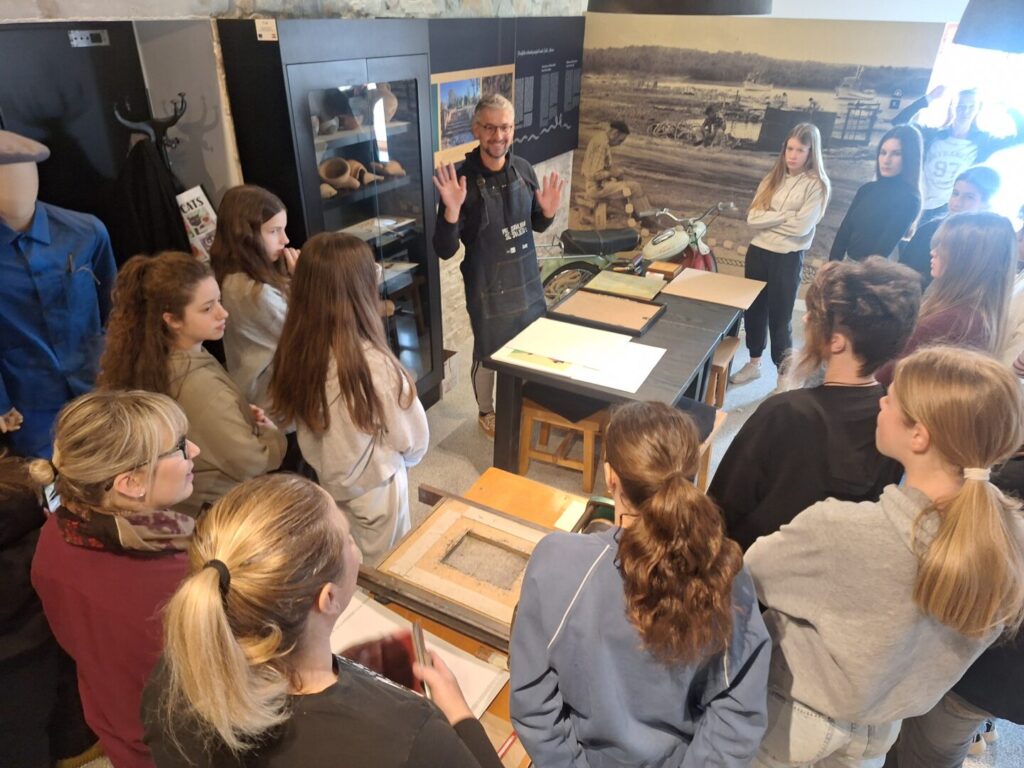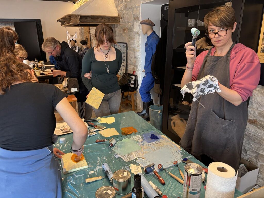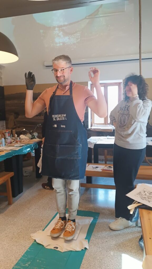 Radionicu su osmislili i vodili Slaven Jurić i Marina Dželalija Jakominić. Uz teorijski dio i puno praktičnog rada, u dva dana otisnuli smo oko stotinjak otisaka. Osim klasičnog otiskivanja na papiru, ove godine zadnji dio radionice posvetili smo otiskivanju na tekstilu, pa su učenici realizirali vrlo zanimljive uspomene na majicama, platnenim vrećicama, pregačama…