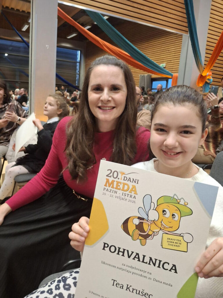 Tea je pohvaljena u kategoriji likovnih radova (razredna nastava), a tim povodom učenici i njezinoj mentorici uručena je pohvalnica i simbolična nagrada. Zajedno su prisustvovale svečanoj dodjeli u Pazinu gdje su s ponosom preuzele zasluženo priznanje za svoj trud, kreativnost i uspješan rad.