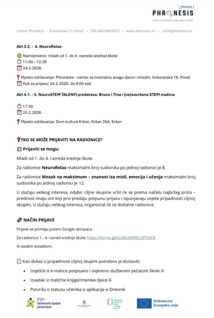 Phronesis – Centar za mentalnu snagu djece i mladih i u veljači nastavlja s besplatnim programima koji djeci i mladima pomažu razvijati fokus, emocionalnu ravnotežu i razumijevanje vlastitog mozga. U Centru Phronesis u Poreču održavaju se radionice NeuroRelax za srednjoškolce (3.2., 10.2. i 24.2. od 11:00 do 12:30) koje kroz kreativne i STEM tehnike te demonstraciju neurofeedbacka uče mlade kako umiriti um i tijelo te se kvalitetno fokusirati.