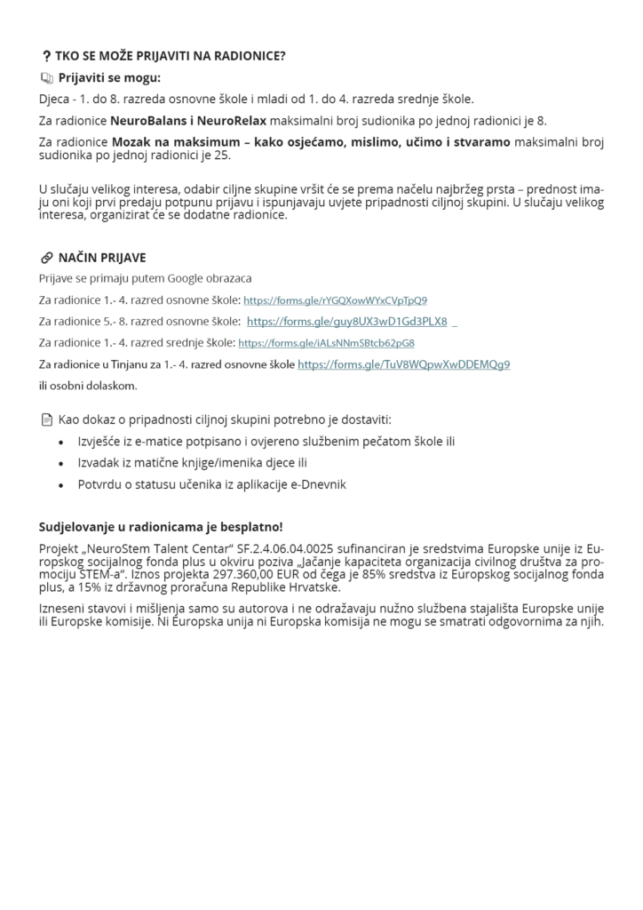 Projekt „NeuroStem Talent Centar“ SF.2.4.06.04.0025 sufinanciran je sredstvima Europske unije iz Europskog socijalnog fonda plus u okviru poziva „Jačanje kapaciteta organizacija civilnog društva za promociju STEM-a“. Iznos projekta 297.360,00 EUR od čega je 85% sredstva iz Europskog socijalnog fonda plus, a 15% iz državnog proračuna Republike Hrvatske.