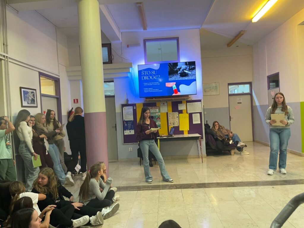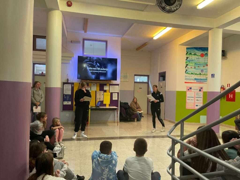 Učenice Evita Kocijančić i Tessa Sloković obradile su jednu od najraširenijih ovisnosti – pušenje. Istaknule su da je nikotin snažan adiktiv i da pušenje, osim što financijski opterećuje, drastično povećava rizik od kroničnih bolesti pluća, srca i krvožilnog sustava.