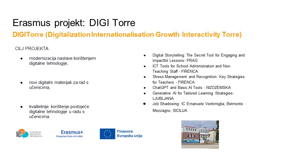 Glavni cilj našeg Erasmus+ projekta je modernizacija nastave korištenjem digitalne tehnologije te razvoj digitalne pismenosti naših učitelja. Učitelji će sudjelovati na međunarodnim tečajevima i edukacijama, a sve naučeno primijenit će u radu s učenicima kako bi nastava bila zanimljivija, interaktivnija i bliža današnjim generacijama. Stručna služba Škole, s druge strane, usavršavat će se u području upravljanja stresom i pružanja psihološke podrške.